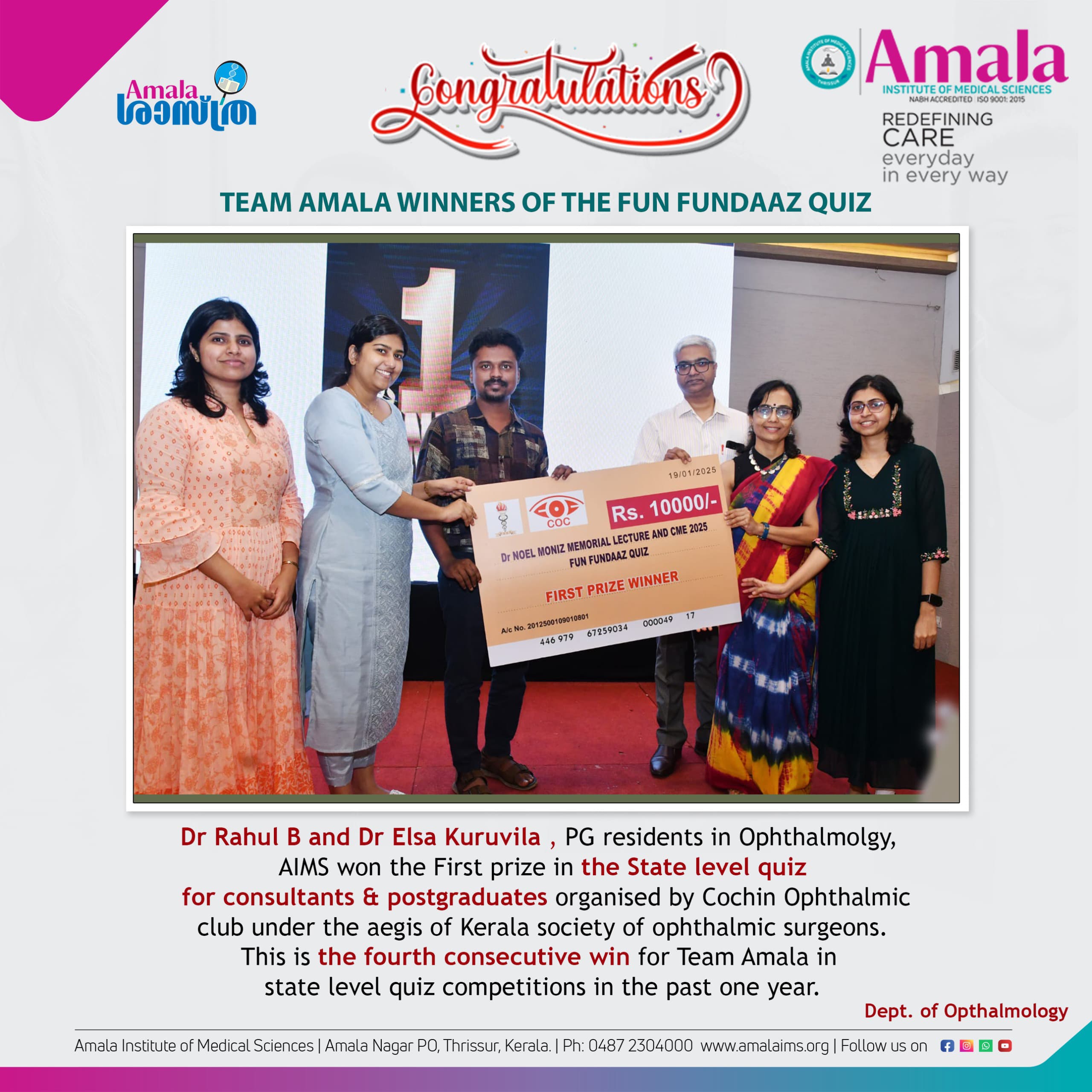 The department of Ophthalmology at AMALA IMS contains a team of impressive Ophthalmologists who are experts in examining, diagnosing and providing the most suitable treatment of all ocular diseases.  The department has kept abreast with the latest technological developments and is capable of treating all types of retinal diseases.