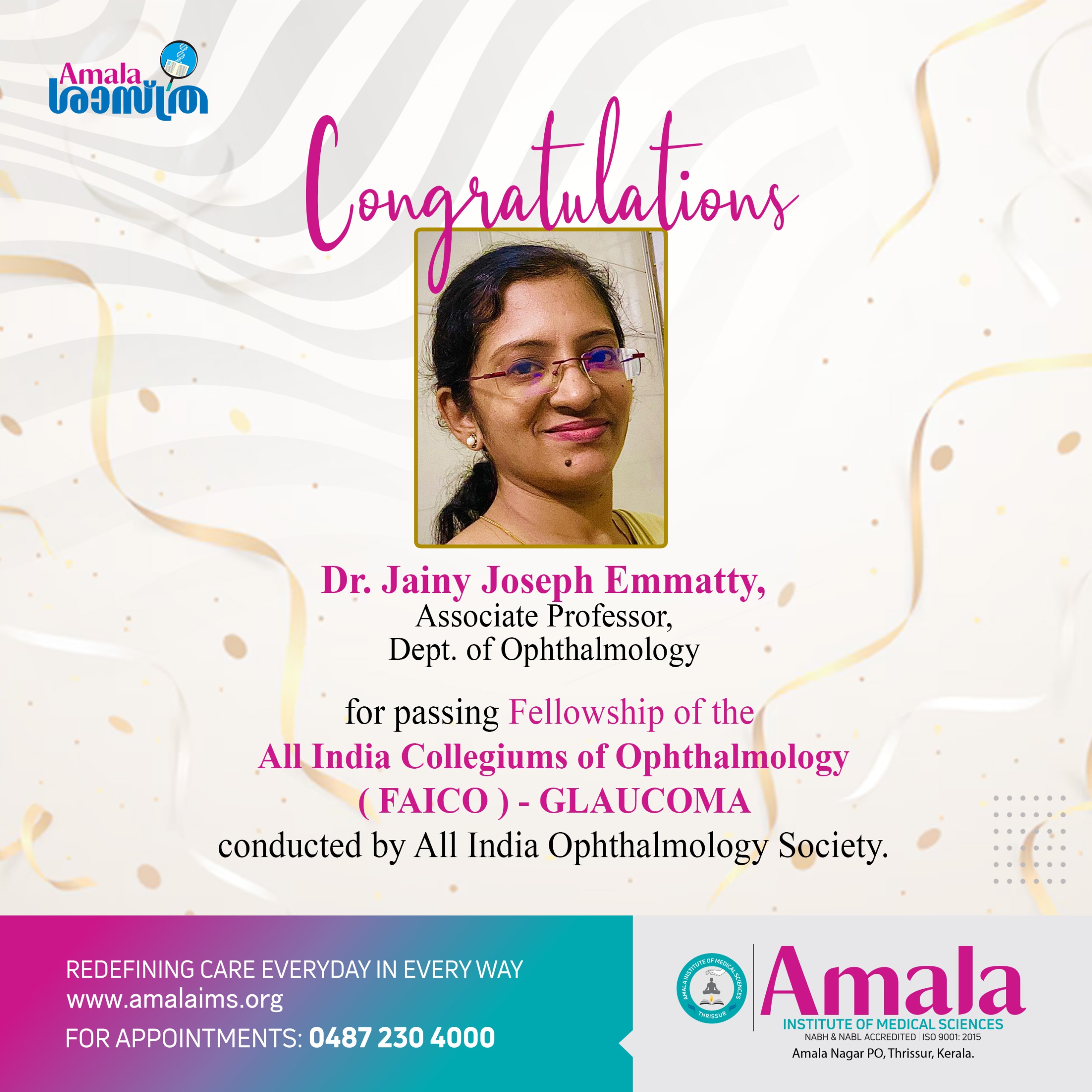 • Macular changes following cataract surgery over six months-Kerala Journal Of Ophthalmology-june2015 Influence of glycaemic control on applanation tonometry in diabetic patients- Kerala Journal Of Ophthalmology- June 2010